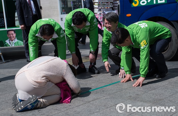 (군포=포커스뉴스) 안철수 국민의당 상임공동대표와 국민의당 후보들이 1일 오전 경기 군포시 산본로데오거리 원형광장에서 정기남 군포시을 후보 지원 유세 중 한 여성 지지자가 큰절을 하자 함께 맞절을 하고 있다.