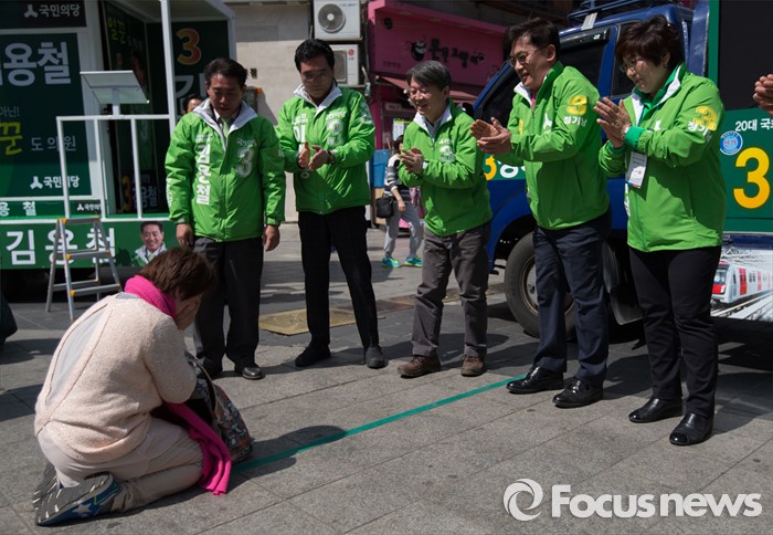 (군포=포커스뉴스) 안철수 국민의당 상임공동대표와 국민의당 후보들이 1일 오전 경기 군포시 산본로데오거리 원형광장에서 정기남 군포시을 후보 지원 유세 중 한 지지자에게 큰절을 받고 있다.