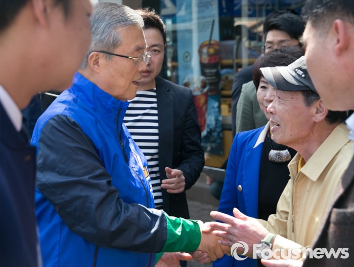 (전주=포커스뉴스) 1일 오전 전북 전주 모래내시장 입구에서 더불어민주당 최형재 전주을, 김성주 전주병 후보 유세를 마친 김종인 비대위 대표 겸 선대위원장이 시민과 인사하며 지지를 호소하고 있다.