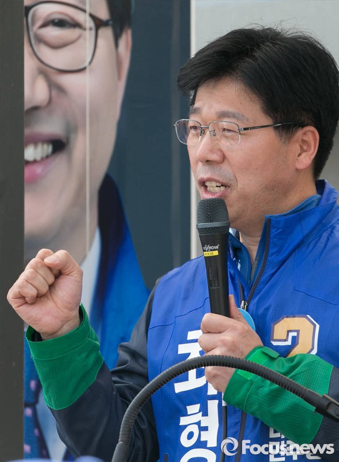 (전주=포커스뉴스) 1일 오전 전북 전주 모래내시장 입구에서 열린 더불어민주당 최형재 전주을, 김성주 전주병 후보 유세에 참여한 최 후보가 지지를 호소하고 있다.