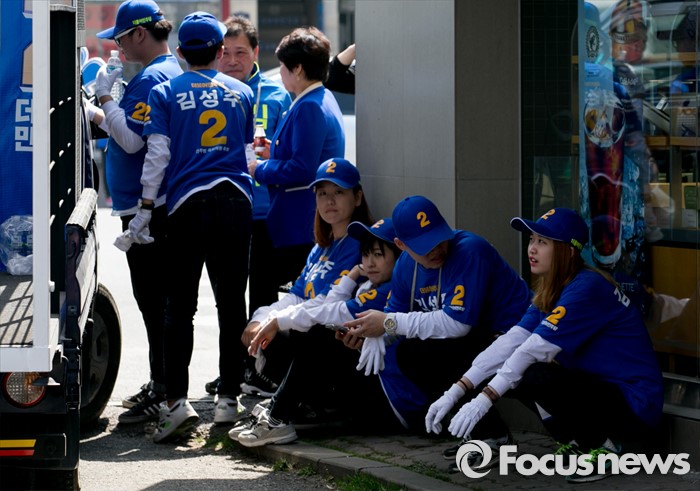 (전주=포커스뉴스) 1일 오전 전북 전주 모래내시장 입구에서 열린 더불어민주당 최형재 전주을, 김성주 전주병 후보 유세에 참여한 선거운동원들이 잠시 휴식을 보내고 있다.