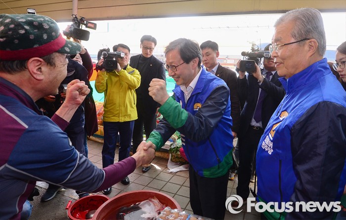 (전주=포커스뉴스) 1일 오전 전북 전주 모래내시장을 방문한 김종인(오른쪽) 더불어민주당 비대위 대표 겸 선대위원장과 김성주 전주병 후보가 상인들과 인사하며 지지를 호소하고 있다.