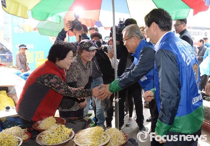 (전주=포커스뉴스) 1일 오전 전북 전주 모래내시장을 방문한 김종인 더불어민주당 비대위 대표 겸 선대위원장과 김성주 전주병 후보가 상인들과 인사하며 지지를 호소하고 있다.