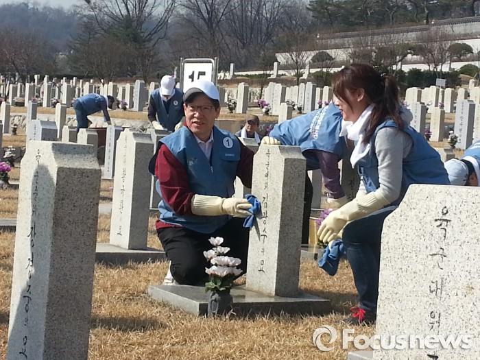 묘역관리 직원의 안내에 따라 저마다 흰 수건을 목에 두르고 양동이에 물을 받아 묘비를 닦기 시작했다. 권 회장도 자신을 둘러싼 취재진의 시선을 신경쓰지 않고 묵묵히 봉사활동에 임했다. 중간중간 주변 사람들과 물과 간식을 나눠먹거나 덕담을 나누며 시종일관 편안한 표정을 지어보였다.