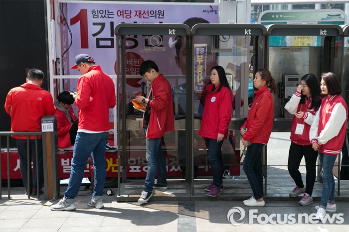 (수원=포커스뉴스) 1일 오전 경기도 수원시 팔달구 수원역 로데오거리 입구에서 새누리당 선거운동원들이 수원지역 후보자 합동 유세에 참석해, 더위를 피해 그늘에서 잠시 쉬고 있다.