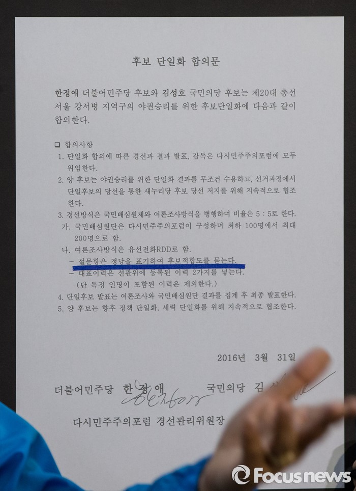 (서울=포커스뉴스) 한정애 더불어민주당 강서병 후보가 1일 오후 서울 여의도 국회 정론관에서 국민의당 김성호 후보와 단일화에 대한 기자회견을 하고 있다. 서울 강서병 지역 한정애 더민주 후보, 김성호 국민의당 후보 간의 단일화는 첫 수도권 단일화 합의로 관심을 모았으나 당명 사용 문제가 해결되지 않아 진통을 겪을 예상이다.