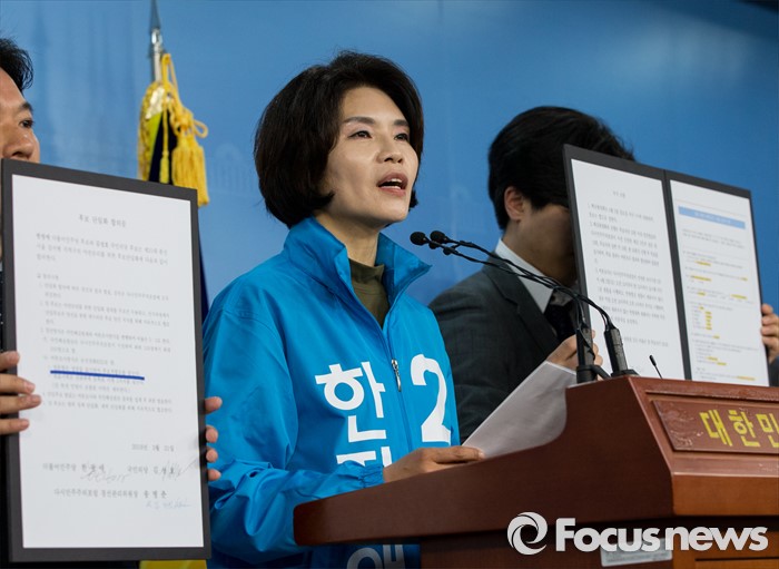(서울=포커스뉴스) 한정애 더불어민주당 강서병 후보가 1일 오후 서울 여의도 국회 정론관에서 국민의당 김성호 후보와 단일화에 대한 기자회견을 하고 있다. 서울 강서병 지역 한정애 더민주 후보, 김성호 국민의당 후보 간의 단일화는 첫 수도권 단일화 합의로 관심을 모았으나 당명 사용 문제가 해결되지 않아 진통을 겪을 예상이다.