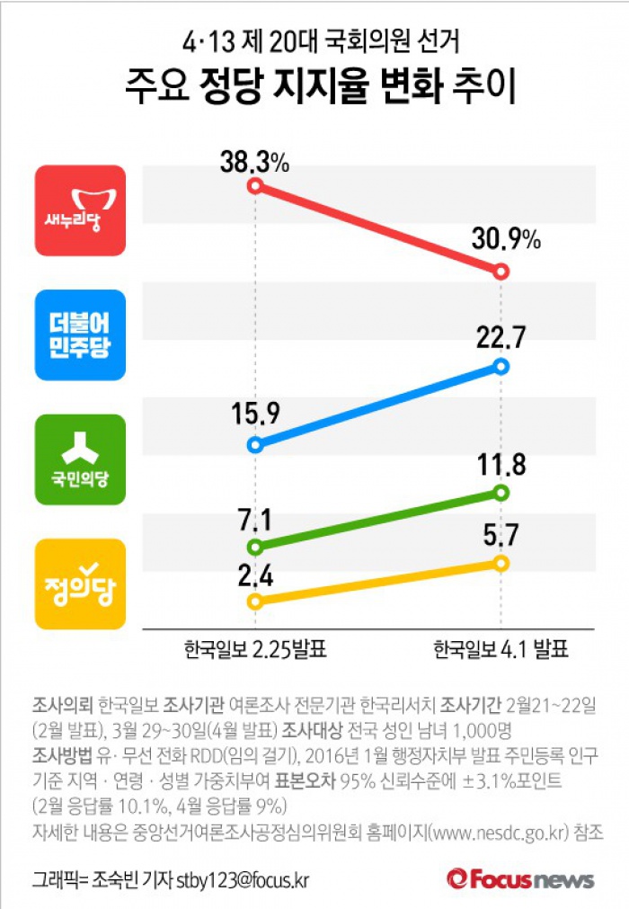 (서울=포커스뉴스) 한국일보가 1일 발표한 여론조사 결과에 따르면, 일여다야(一與多野) 구도로 시작해 '야권 위기론'이 고개를 내민 제20대 총선에서 새누리당의 지지율은 하락한 반면 야권 지지율은 상승한 것으로 나타났다.