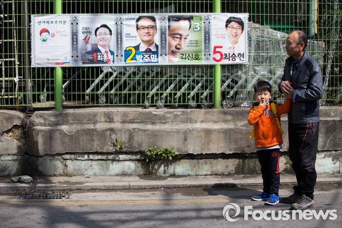 (서울=포커스뉴스) 1일 오후 문재인 전 더불어민주당 대표가 서울 은평구 역촌노인복지회관 인근에서 박주민 은평갑 후보와 함께 유세를 하는 가운데 한 주민이 문재인 전 대표와 기념사진을 찍기위해 선거벽보 앞에서 문 전 대표를 기다리고 있다.