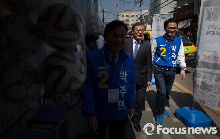 (서울=포커스뉴스) 1일 오후 문재인 전 더불어민주당 대표가 서울 은평구 역촌노인복지회관 인근에서 박주민 은평갑 후보와 함께 유세를 하고 있다.
