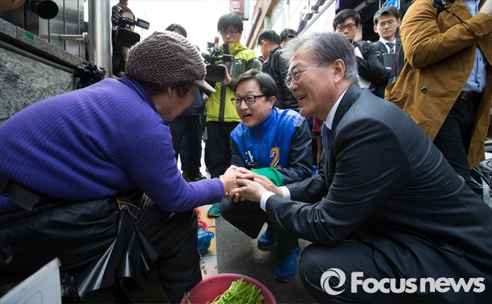 | △ '유권자 손 잡은 문재인과 강병원' |