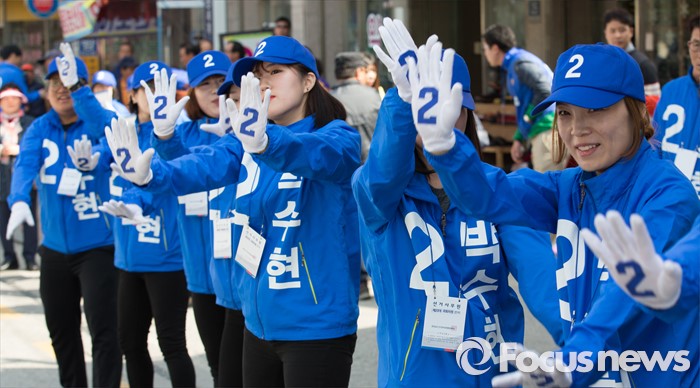 (공주=포커스뉴스) 1일 충남 공주시 산성시장 일원에서 박수현 더불어민주당 후보 선거운동원들이 율동을 하며 지지를 호소하고 있다.