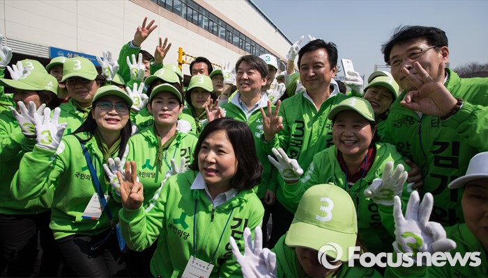(안산=포커스뉴스) 안철수 국민의당 상임공동대표와 김영환 상록구을 후보, 김기완 단원갑 후보 1일 오후 안산시 상록구 상록수역 월드프라자 앞에서 선거 유세를 하던 중 선거운동원들과 함께 기념사진을 찍고 있다. 둘 째줄 오른쪽부터 김기완 단원갑 후보, 김영환 후보, 안 대표