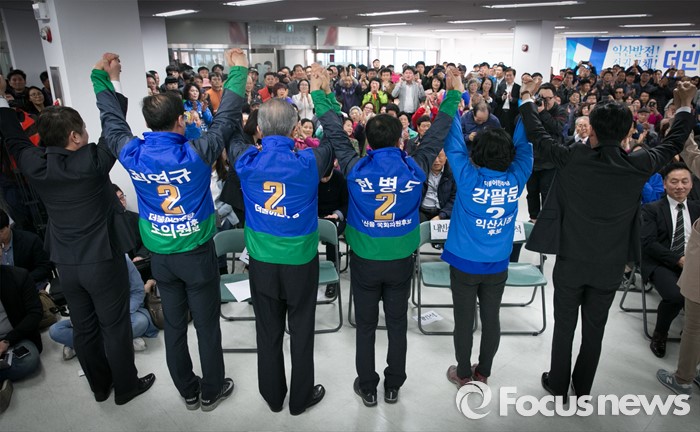 (익산=포커스뉴스) 김종인 더불어민주당 비대위 대표 겸 선대위원장과 내빈들이 1일 오후 한병도 전북 익산을 후보 선거사무소에서 열린 개소식에 참석해 시민 및 지지자들을 향해 손을 들어 인사하고 있다. 왼쪽부터 최재성 의원, 최영규 도의원 후보, 김 대표, 한 후보, 강팔문 익산시장 후보 부인, 정청래 의원.