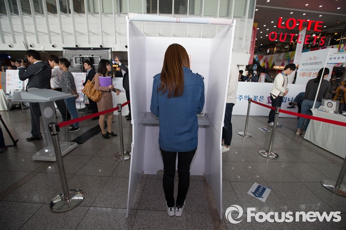 (서울=포커스뉴스) 1일 오후 서울 용산구 서울역사에 설치된 제20대 국회의원선거 투표참여 홍보관에서 시민들이 사전투표 체험을 하고 있다. 체험관은 이달 1일부터 6일까지 운영한다.