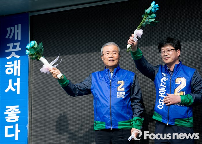(완주=포커스뉴스) 1일 오후 전북 완주군 둔산공원 앞 사거리에서 김종인(왼쪽) 더불어민주당 비대위 대표 겸 선대위원장과 안호영 완주·진안·무주·장수군 후보가 지지자들로부터 꽃을 전달받은 뒤 포즈를 취하고 있다.