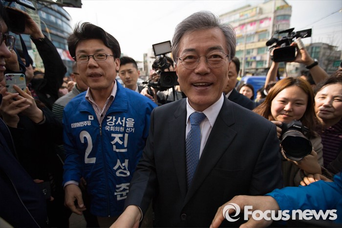 (서울=포커스뉴스) 1일 오후 문재인 전 더불어민주당 대표가 서울 강서구 방신재래시장에서 진성준 강서을 후보와 함께 유세를 하고 있다.