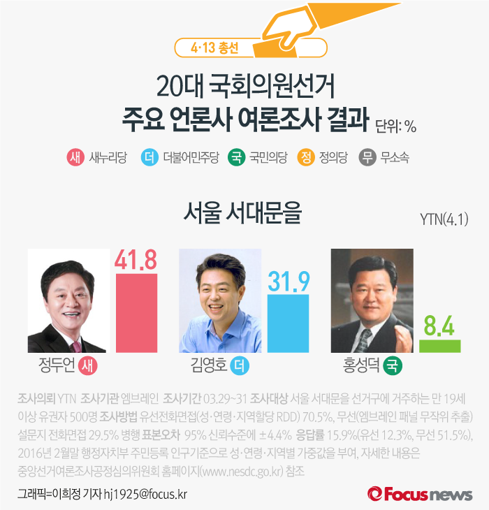 (서울=포커스뉴스) YTN이 엠브레인에 의뢰해 1일 발표한 여론조사 결과에 따르면 새누리당 정두언 후보의 지지율은 41.8%, 더불어민주당 김영호 후보의 지지율은 31.9%, 국민의당 홍성덕 후보는 8.4%를 기록했다.