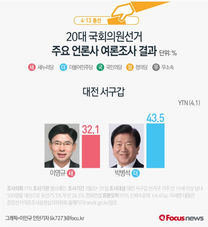 (서울=포커스뉴스) YTN이 엠브레인에 의뢰해 1일 발표한 여론조사 결과에 따르면 새누리당 이영규 후보의 지지율은 32.1%, 더불어민주당 박병석 후보의 지지율은 43.5%를 기록했다.