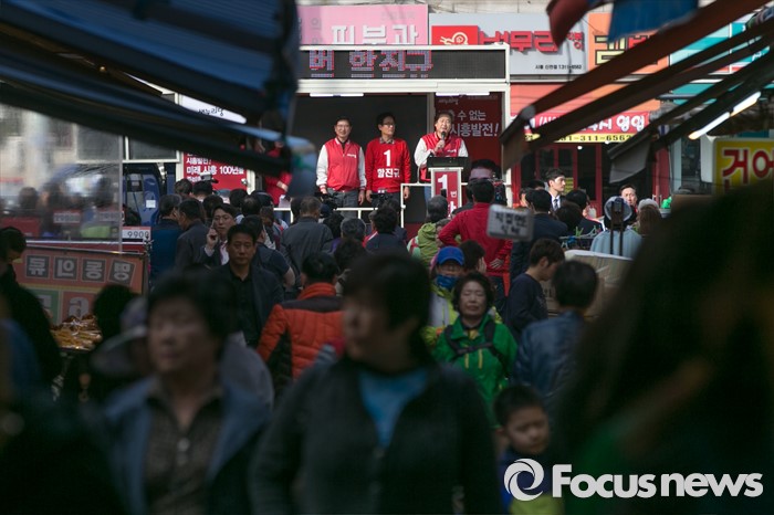 (시흥=포커스뉴스) 김무성(오른쪽) 새누리당 대표가 1일 오후 경기도 시흥시 삼미시장 입구에서 열린 함진규(가운데) 시흥갑 후보 지원 유세를 하고 있다.