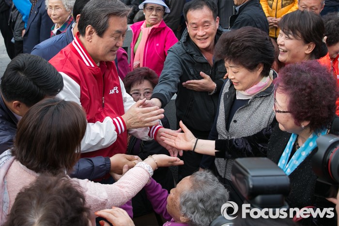 (시흥=포커스뉴스) 김무성 새누리당 대표가 1일 오후 경기도 시흥시 삼미시장 입구에서 함진규 시흥갑 후보 지원 유세를 마친 뒤, 시민들과 악수하고 있다.