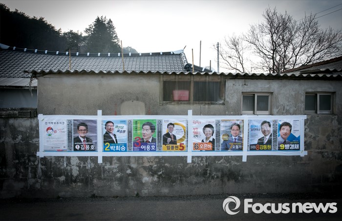 (순창=포커스뉴스) 20대 총선을 열흘여 앞둔 1일 전북 순창군 한 마을에 후보자들의 벽보가 붙어 있다. 호남을 중심으로 야권분열 상황을 보이는 것과 대조를 이루며 조용한 분위기의 모습이다.