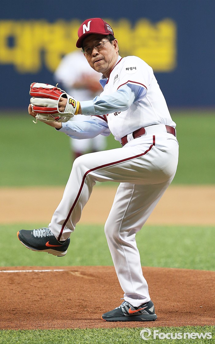 (서울=포커스뉴스) 1일 오후 서울 구로구 고척스카이돔에서 열린 2016 타이어뱅크 프로야구 개막전 넥센 히어로즈와 롯데 자이언츠 경기에 앞서 박원순 서울시장이 시구하고 있다.