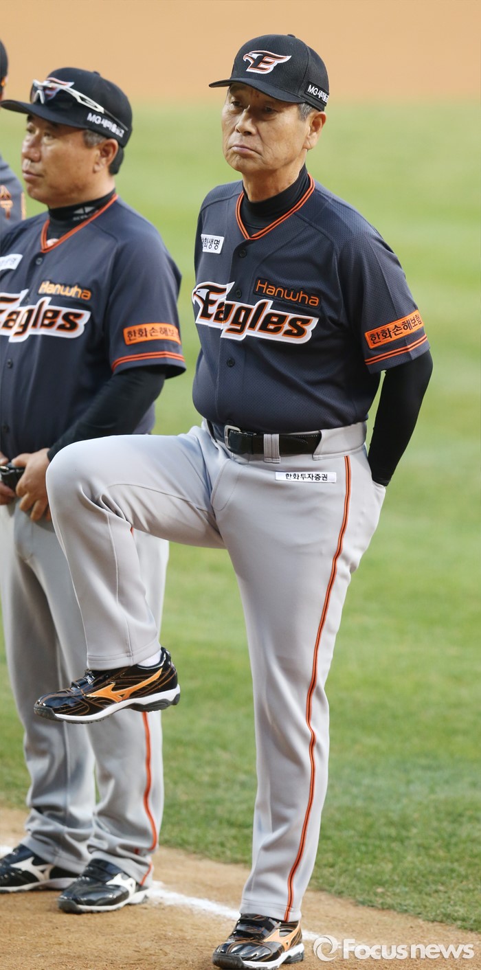 (서울=포커스뉴스) 1일 서울 잠실구장에서 열린 2016프로야구 개막전 한화-LG 경기에 앞서 열린 개막식에서 김성근 한화 감독이 선수 소개를 기다리며 다리를 풀고 있다. 왼쪽은 김광수 코치.