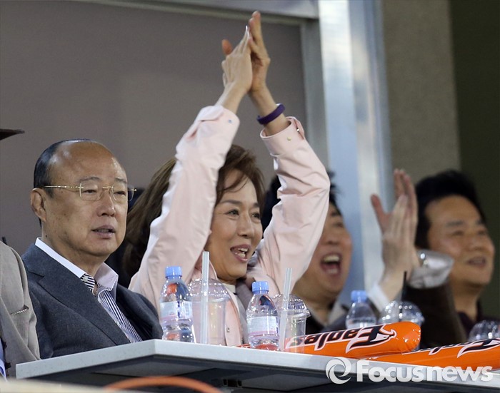 (서울=포커스뉴스) 1일 김승연 한화 그룹회장이 부인 서영민 여사와 함께 서울 잠실구장에서 열린 2016프로야구 개막전 한화-LG 경기를 관전하고 있다.