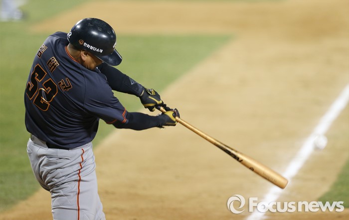 (서울=포커스뉴스) 1일 서울 잠실구장에서 열린 2016프로야구 개막전 한화-LG 경기5회초 1사 2루에서 한화 김태균이 좌익수쪽 직선타구를 날리고 있다.