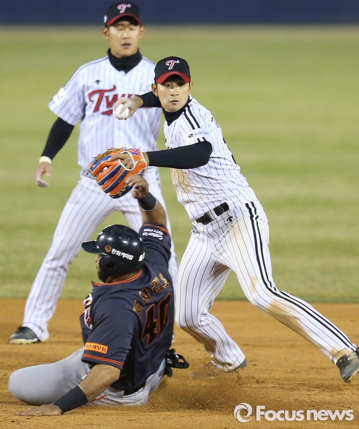 (서울=포커스뉴스) 1일 서울 잠실구장에서 열린 2016프로야구 개막전 한화-LG 경기5회초 1사 1,3루에서 한화 최진행의 2루 땅볼때 LG 유격수 강승호가 볼을 잡아 2루를 태그해 로사리오를 아웃시킨후 1루로 송구하고 있다. 병살플레이 성공.