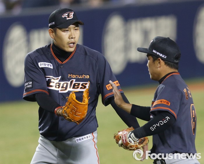 (서울=포커스뉴스) 1일 서울 잠실구장에서 열린 2016프로야구 개막전 한화-LG 경기 7회말 실점 위기를 넘긴 한화 투수 권혁이 수비를 마치고 들어오는 정근우와 손을 마주치고 있다.