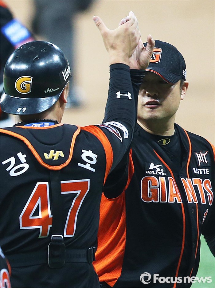 (서울=포커스뉴스) 1일 오후 서울 구로구 고척스카이돔에서 열린 2016 타이어뱅크 프로야구 개막전 넥센 히어로즈와 롯데 자이언츠의 경기 9회말 2사 상황 넥센 고종욱을 땅볼 처리하며 세이브를 기록한 롯데 마무리투수 손승락이 포수 강민호와 하이파이브 하고 있다.