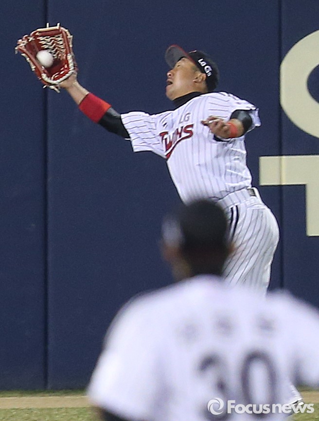 (서울=포커스뉴스) 1일 서울 잠실구장에서 열린 2016프로야구 개막전 한화-LG 경기 7회초 2사 1루에서 LG 좌익수 이병규(7)가 한화 로사리오의 타구를 펜스 앞에서 잡고 있다.