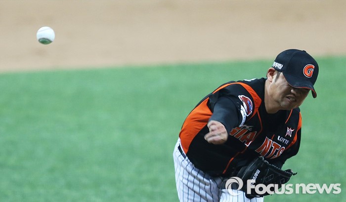 (서울=포커스뉴스) 1일 오후 서울 구로구 고척스카이돔에서 열린 2016 타이어뱅크 프로야구 개막전 넥센 히어로즈와 롯데 자이언츠의 경기 9회말 롯데 마무리 투수 손승락이 투구하고 있다.
