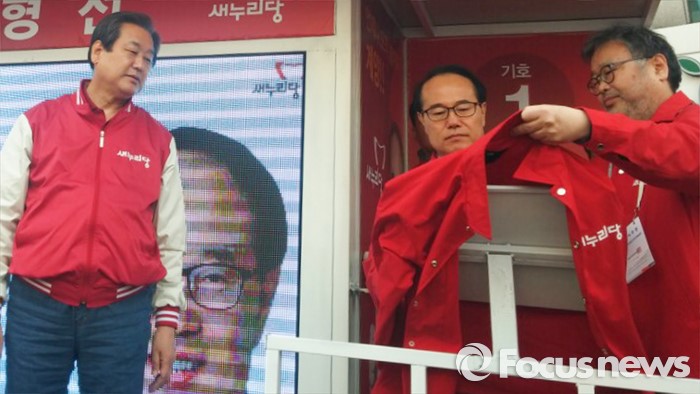 (인천=포커스뉴스) 김무성(왼쪽) 새누리당 대표가 2일 오전 인천 계양구 병방시장 입구에서 열린 윤형선(가운데) 계양을 후보 지원 유세에 참석해 윤 후보 자켓을 쳐다보고 있다.
