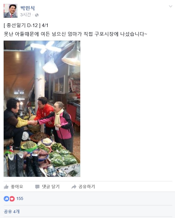 박 후보는 2일 오전 자신의 페이스북에 어머니와 함께 전날 구포시장을 방문한 사진을 게재하며 "못난 아들 때문에 여든 넘으신 엄마가 직접 구포시장에 나섰다"고 밝혔다.