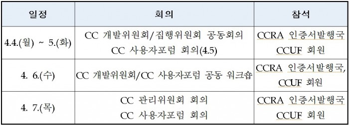 CCRA 상반기 정기총회에 참석한 송정수 미래부 정보보호정책관은 “이번 CCRA 정기총회 개최를 통해 우리나라 정보보호제품의 국제경쟁력 강화방안을 모색하고 글로벌 협력 활동을 지속하겠다”고 밝혔다.CCRA 정기총회 주요일정.<표제공=미래부>