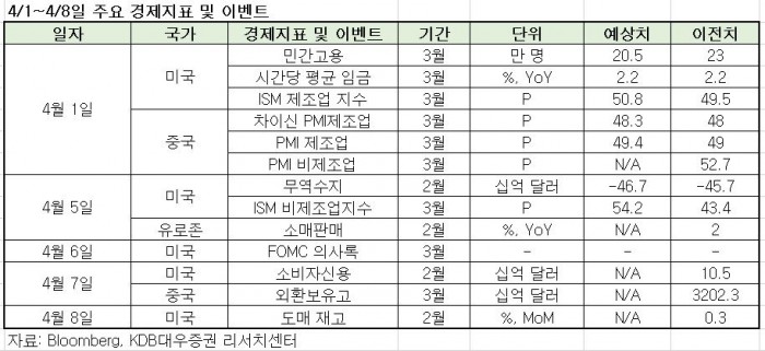 이번주 주목할 이벤트와 경제지표는 ▲미국 3월 연방공개시장위원회(FOMC) 의사록 발표 ▲중국 3월 외환보유고 발표 등이 있다.