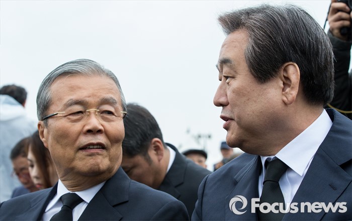 (제주=포커스뉴스) 3일 오전 제주 4ㆍ3 평화공원에서 열린 제68주년 4ㆍ3희생자 추념식에 참석한 김무성(오른쪽) 새누리당 대표와 김종인 더불어민주당 비상대책위원회 대표가 대화하고 있다.