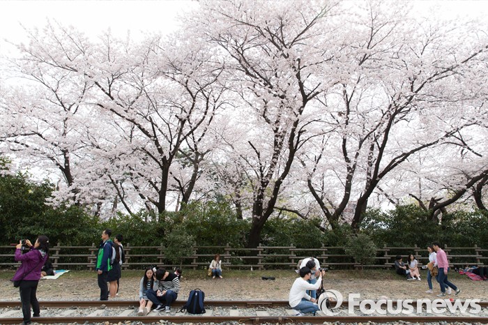(창원=포커스뉴스) 2일 오후 경남 창원시 진해구 경화역을 찾은 관광객들이 만개한 벚꽃을 보며 즐거운 시간을 보내고 있다.