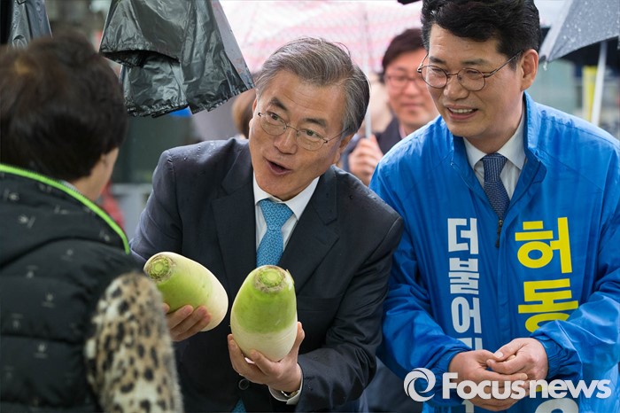 (서울=포커스뉴스) 선거운동이 시작되고 첫 주말을 맞은 3일 오후 문재인 전 더불어민주당 대표가 서울 동작구 남성시장에서 허동준 더불어민주당 동작을 후보와 합동유세를 하고 있다.