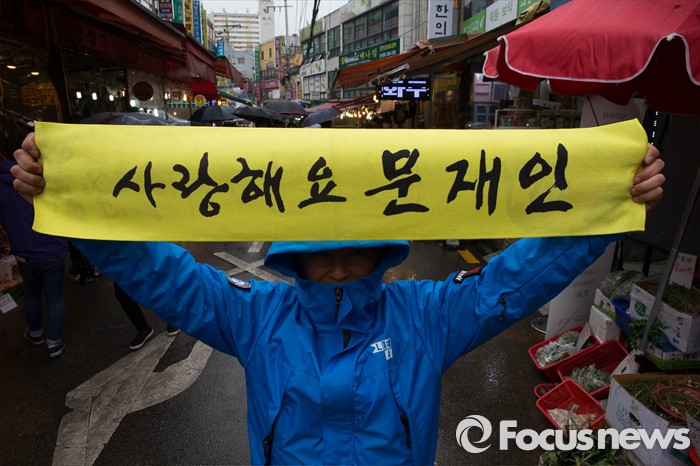 (서울=포커스뉴스) 선거운동이 시작되고 첫 주말을 맞은 3일 오후 문재인 전 더불어민주당 대표가 서울 동작구 남성시장에서 허동준 더불어민주당 동작을 후보와 합동유세를 했다. 한 시민이 문재인을 지지하는 손펫말을 들고 있다.