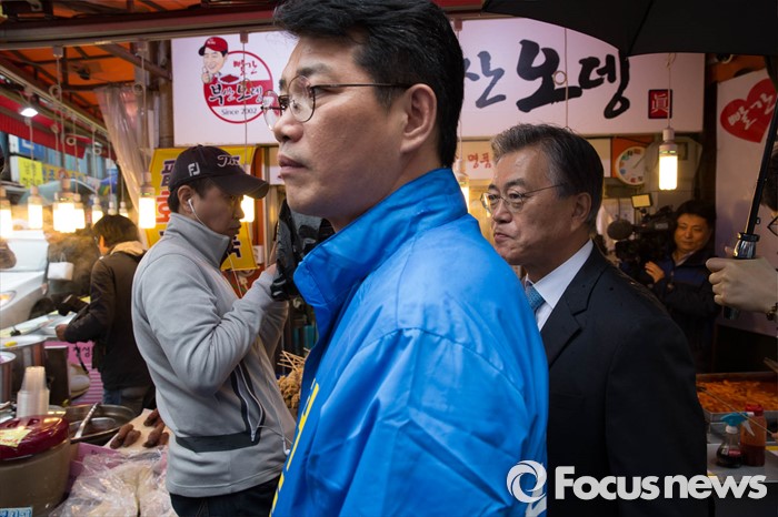 (서울=포커스뉴스) 선거운동이 시작되고 첫 주말을 맞은 3일 오후 문재인 전 더불어민주당 대표가 서울 동작구 남성시장에서 허동준 더불어민주당 동작을 후보와 합동유세를 하고 있다.