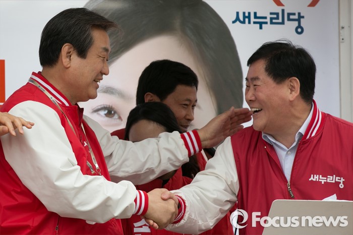 (부산=포커스뉴스) 김무성(왼쪽) 새누리당 대표가 3일 오후 부산광역시 사상구 광장로의 한 대형마트 앞에서 손수조 사상구 후보 지원유세에 참석해, 최경환 전 경제부총리와 악수하고 있다.