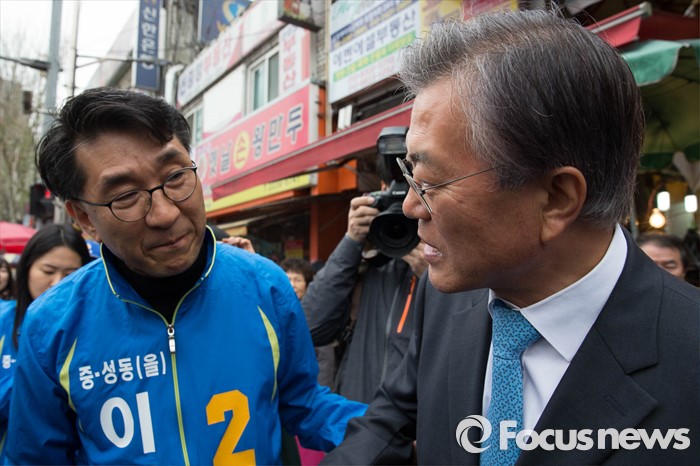 (서울=포커스뉴스) 선거운동이 시작되고 첫 주말을 맞은 3일 오후 문재인 전 더불어민주당 대표가 서울 중구 중앙시장에서 이지수 더불어민주당 중구 성동을 후보와 합동유세를 하고 있다.