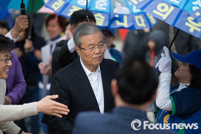 (서울=포커스뉴스) 3일 오후 서울 강서구 방화근린공원 일대에서 김종인 더불어민주당 비대위 대표 겸 선대위원장이 진성준 강서을 후보와 함께 유세를 하고 있다.