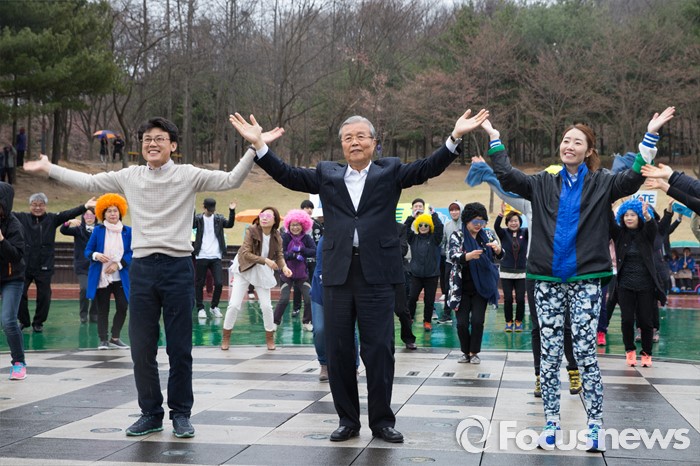 (서울=포커스뉴스) 3일 오후 서울 강서구 방화근린공원 일대에서 김종인 더불어민주당 비대위 대표 겸 선대위원장이 진성준 강서을 후보와 함께 유세를 하고 있다.