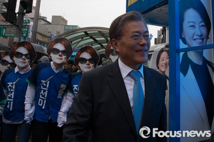 (서울=포커스뉴스) 선거운동이 시작되고 첫 주말을 맞은 3일 오후 문재인 전 더불어민주당 대표가 서울 강동구 암사시장에서 진선미 더불어민주당 강동구갑 후보와 합동유세를 하고 있다.