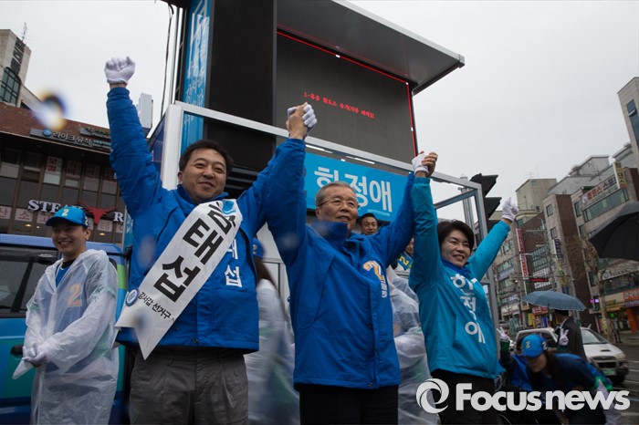 (서울=포커스뉴스) 3일 오후 서울 강서구 화곡역 사거리에서 김종인 더불어민주당 비대위 대표 겸 선대위원장이 강서갑 금태섭, 강서병 한정애 후보와 함께 유세를 하고 있다.